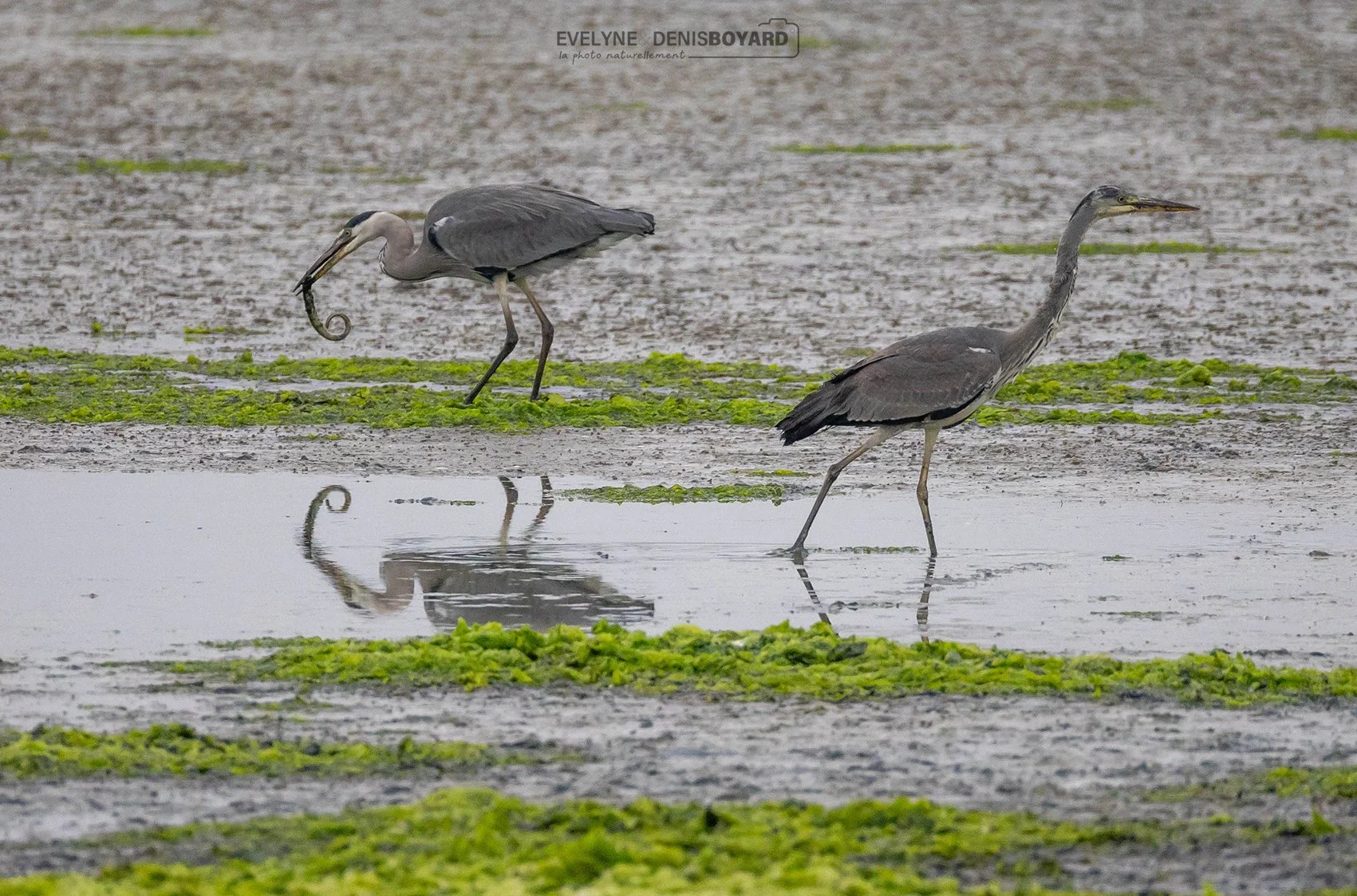 Hérons cendrés, celui de gauche avale une anguille.