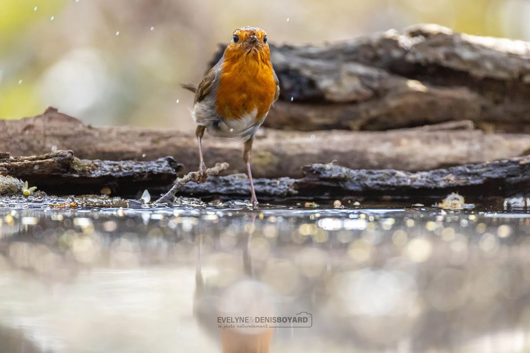 Rouge-gorge familier s'abreuvant à un point d'eau.