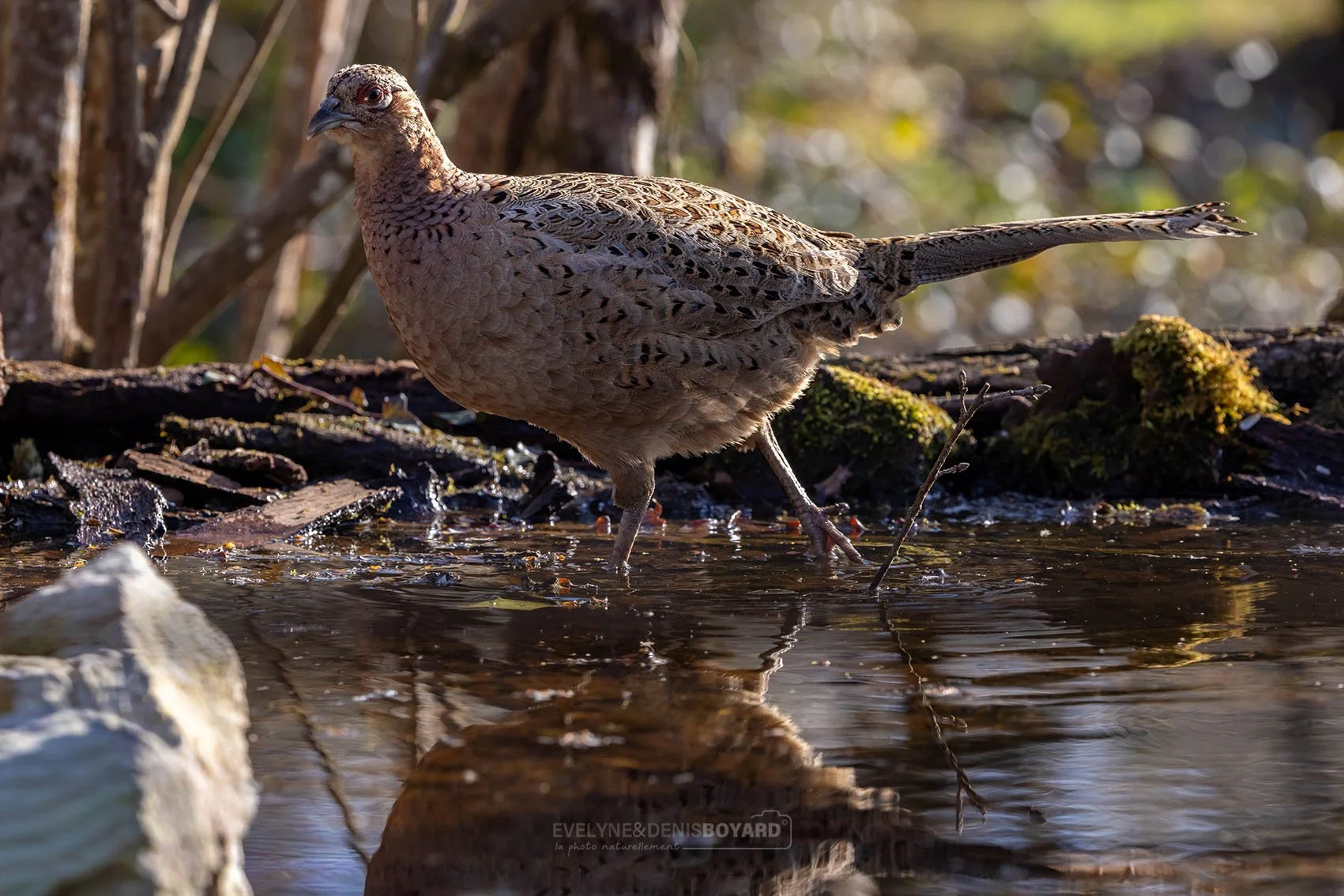 Poule faisane près d'un point d'eau.
