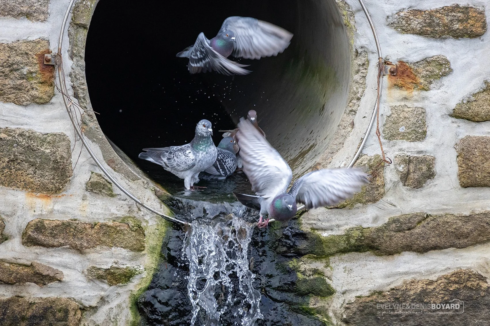 Pigeons bizets s'abreuvant à la sortie d'une évacuation d'eaux usées.