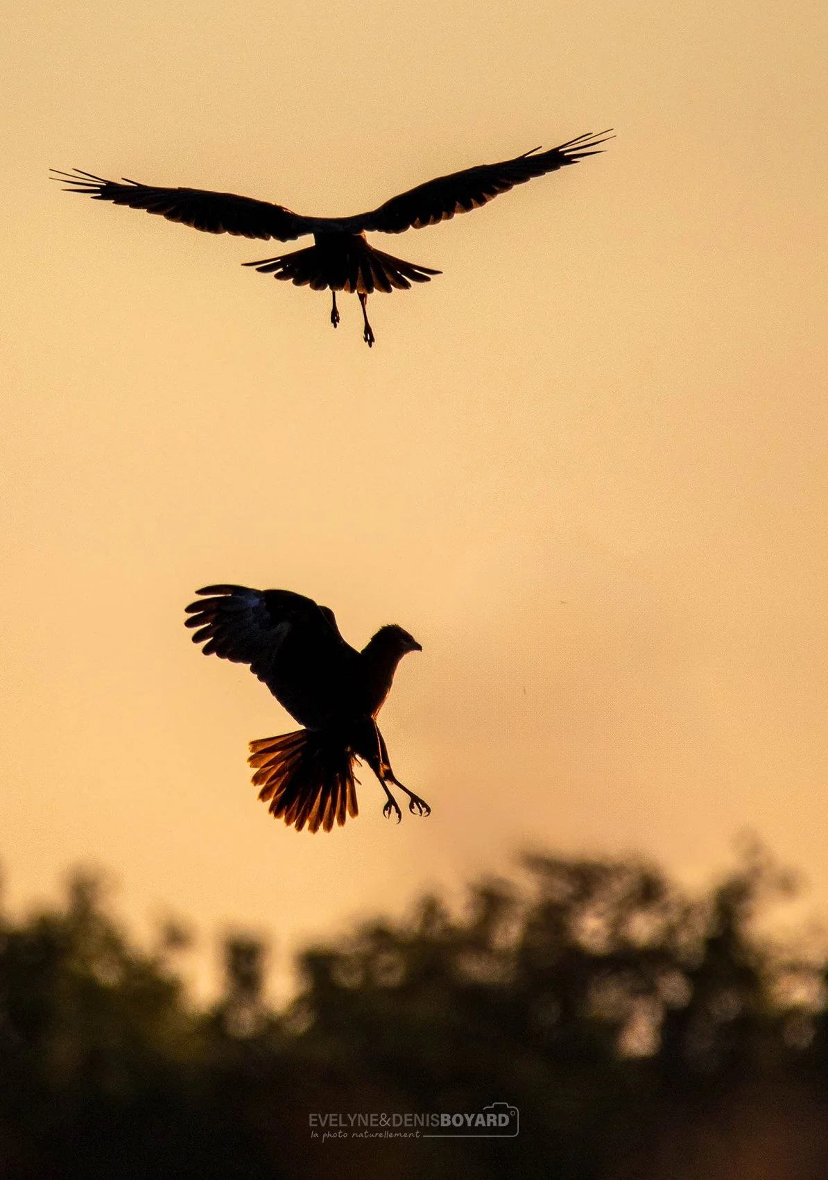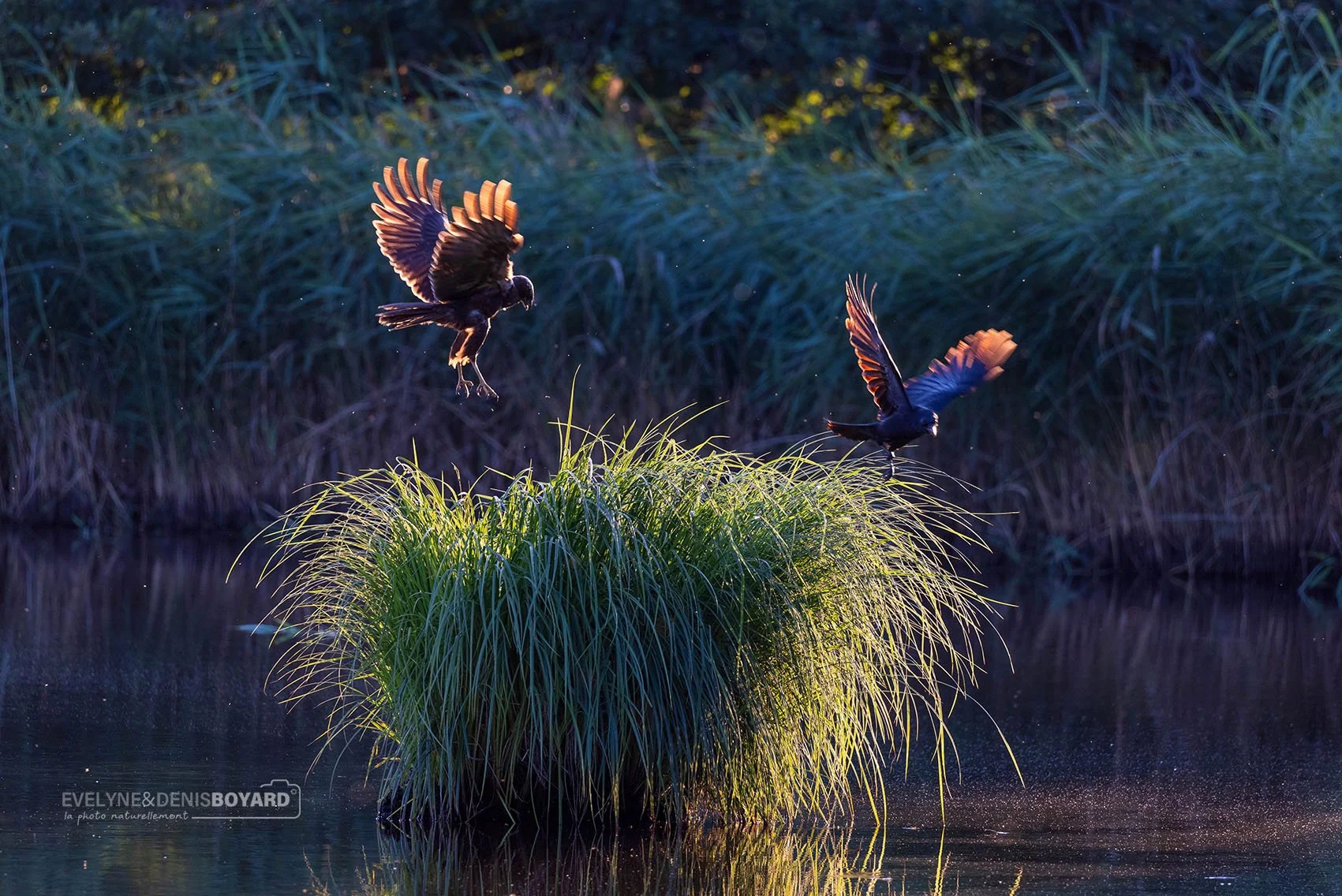 Envol d'un busard des roseaux (à gauche) et d'une corneille (à droite).