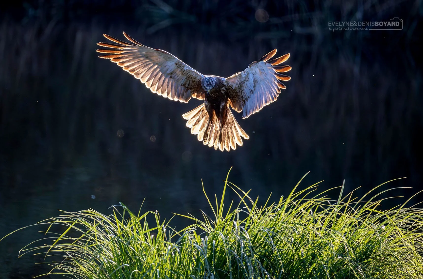 Vol stationnaire du busard des roseaux.
