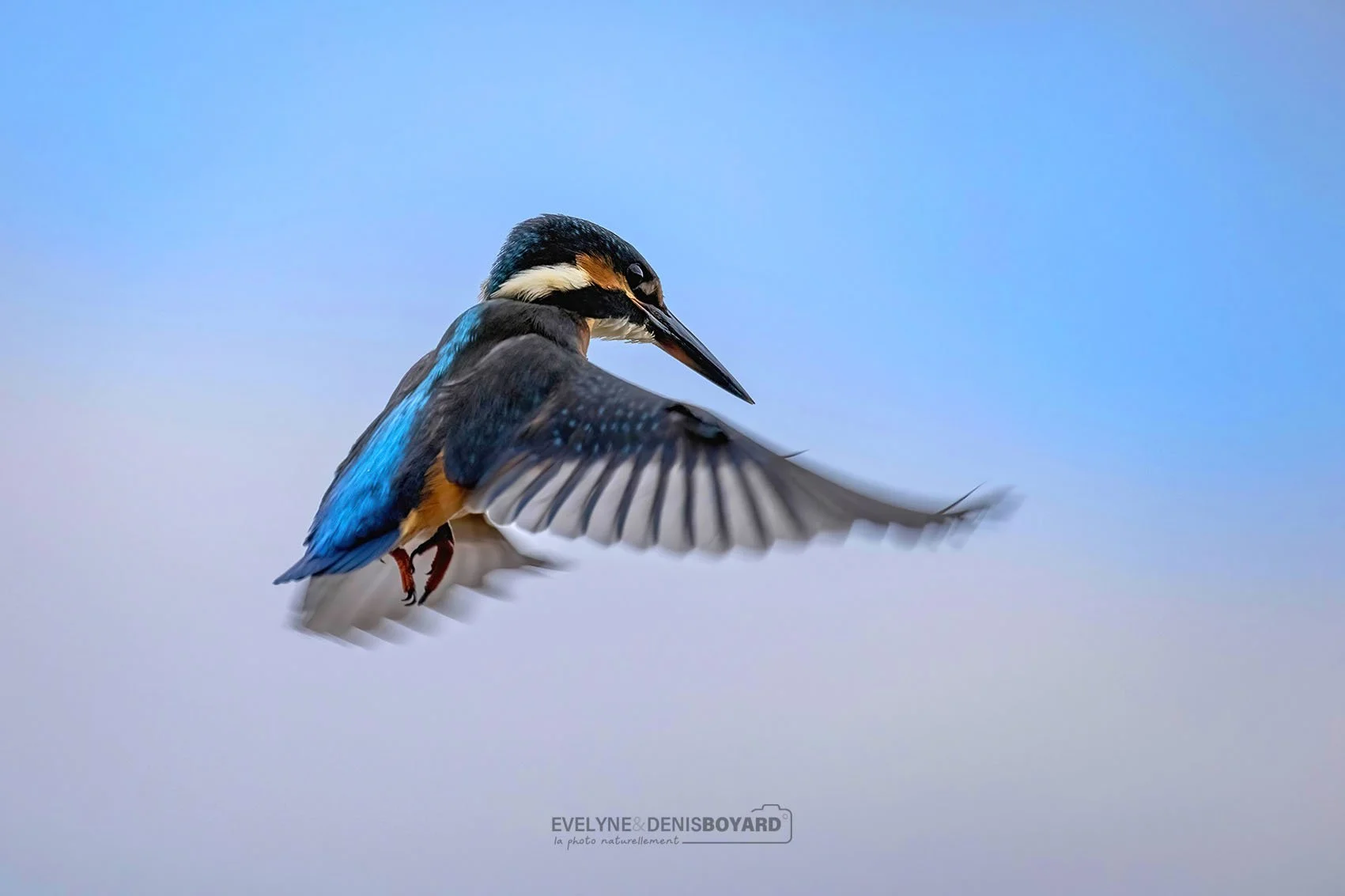 Vol stationnaire d'un martin-pêcheur.
