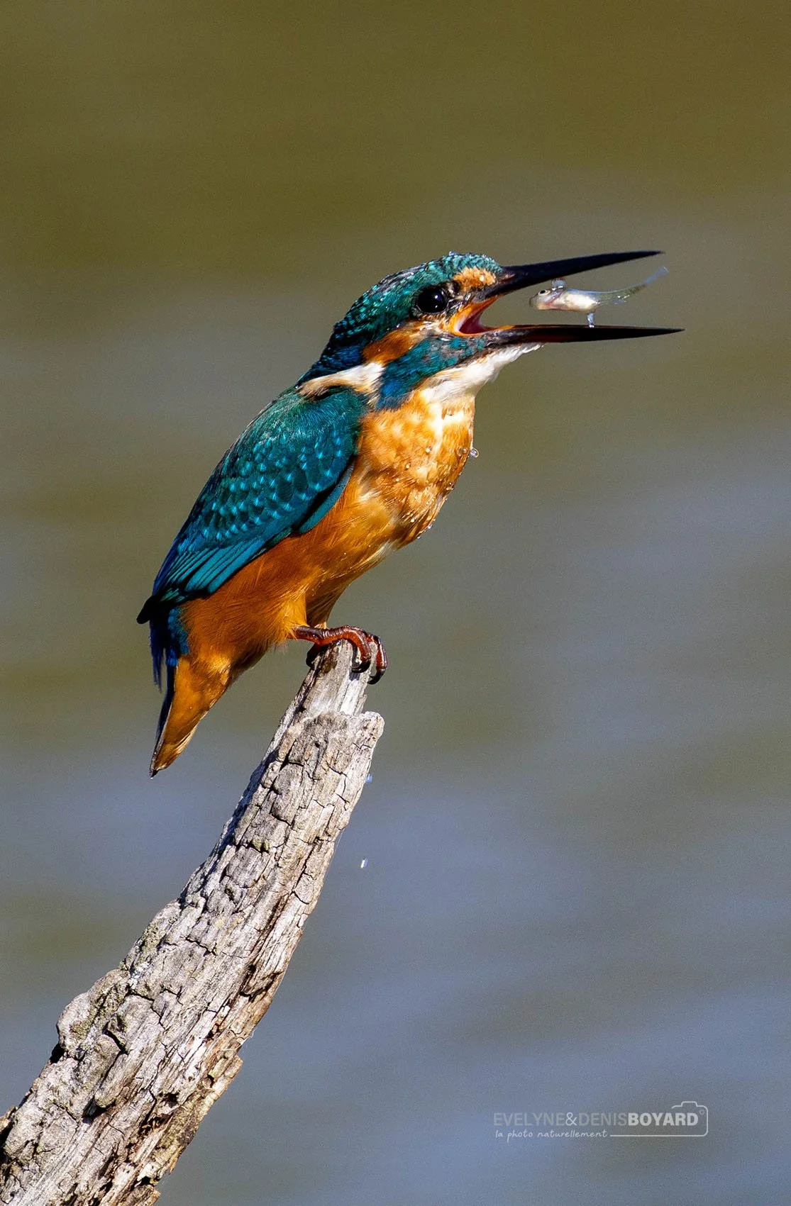Capture d'un poisson par un martin-pêcheur mâle.