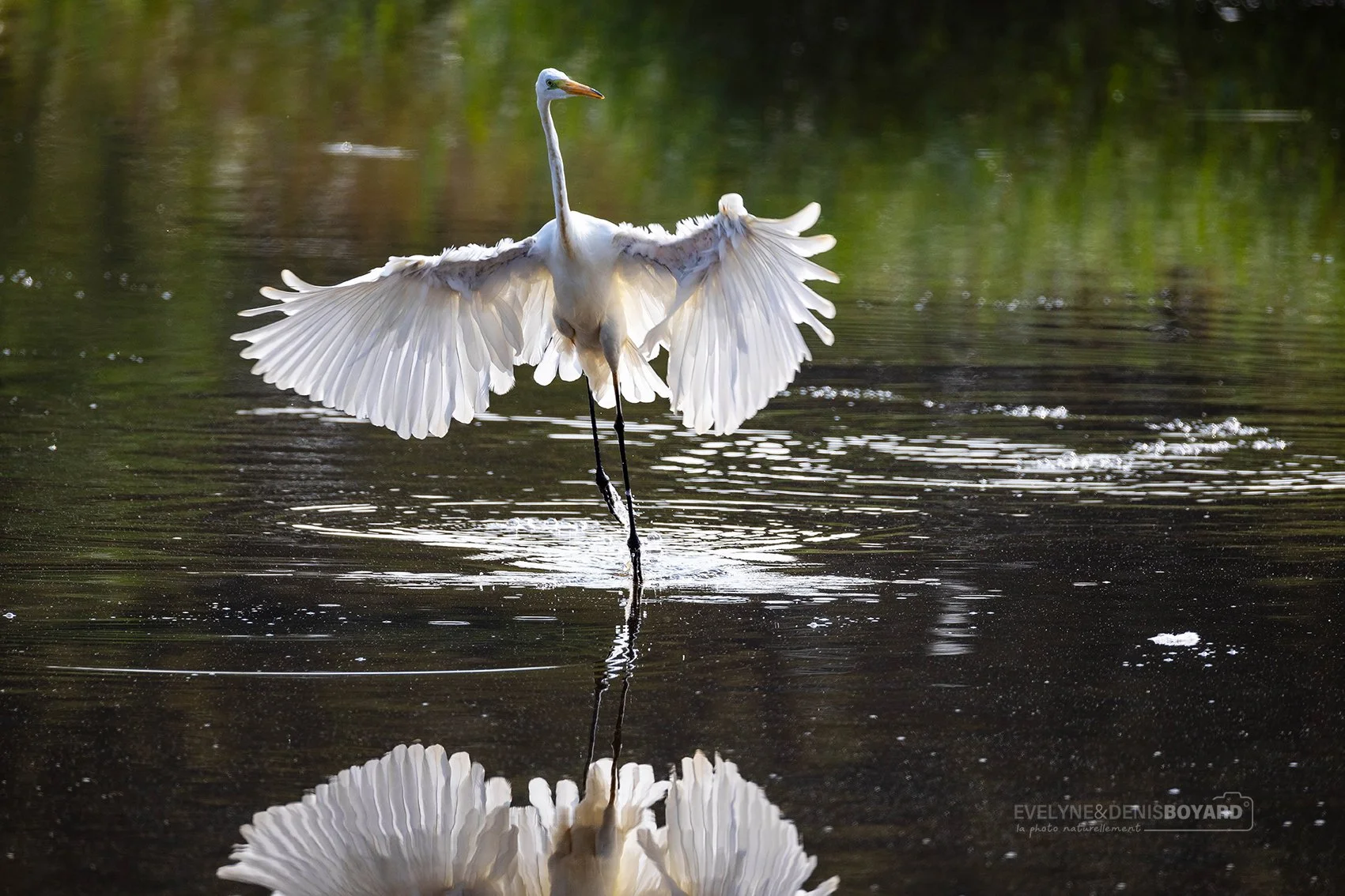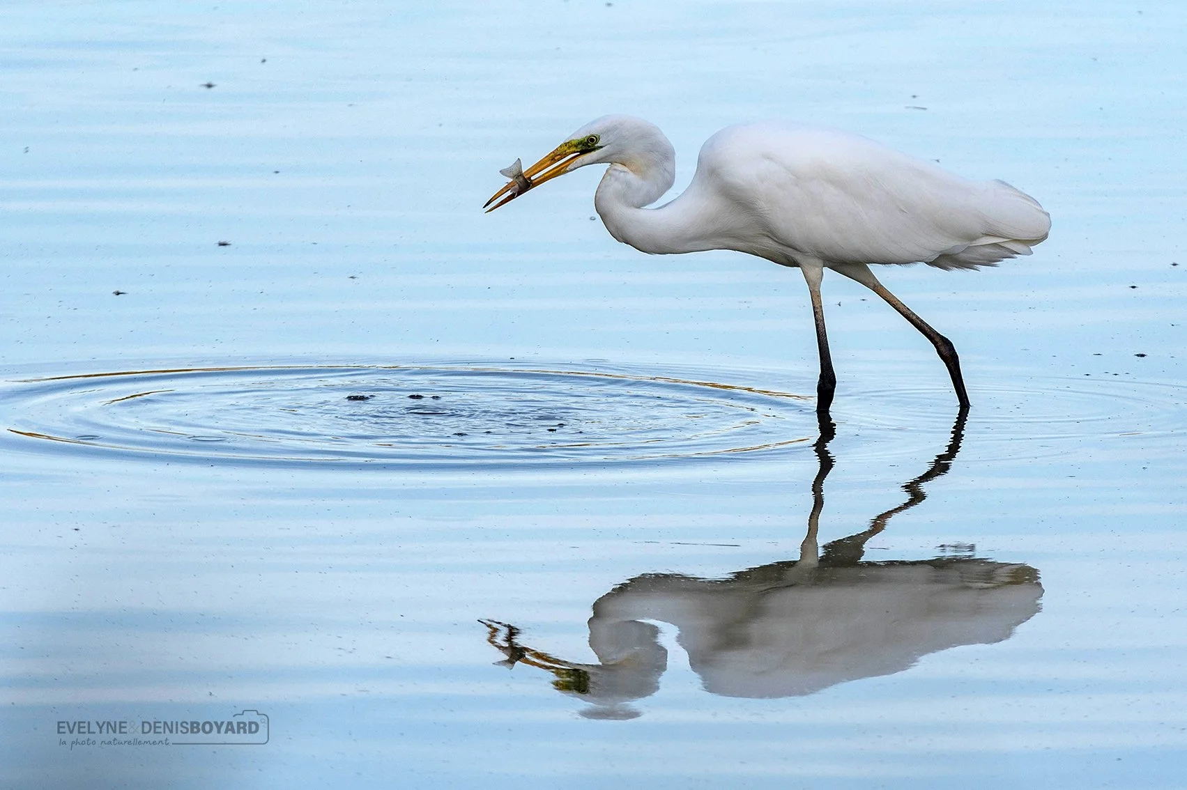 Grande aigrette venant de capturer un poisson.