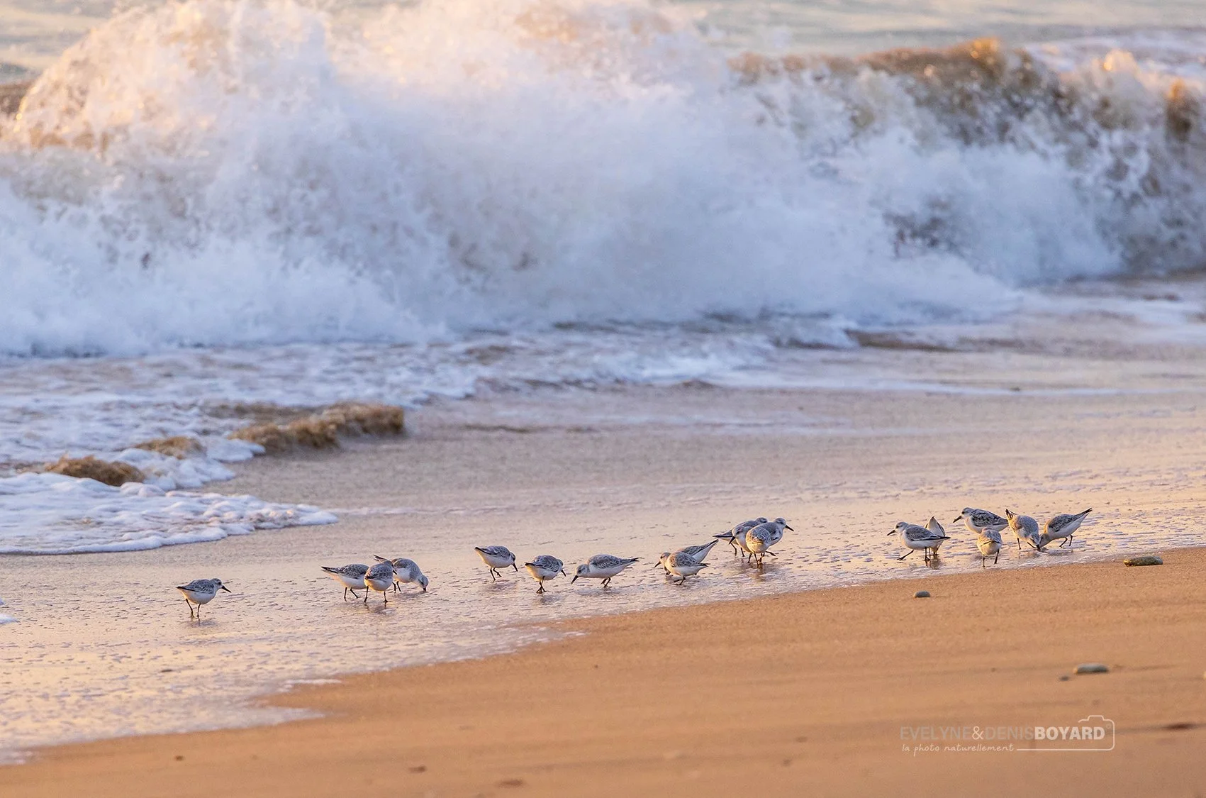 Groupe de bécasseaux sanderling se nourrissant à marée basse.