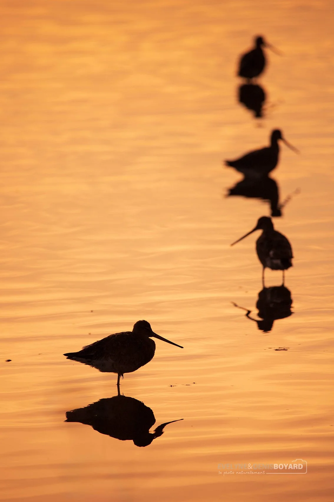 Barges à queue noire au lever de soleil.