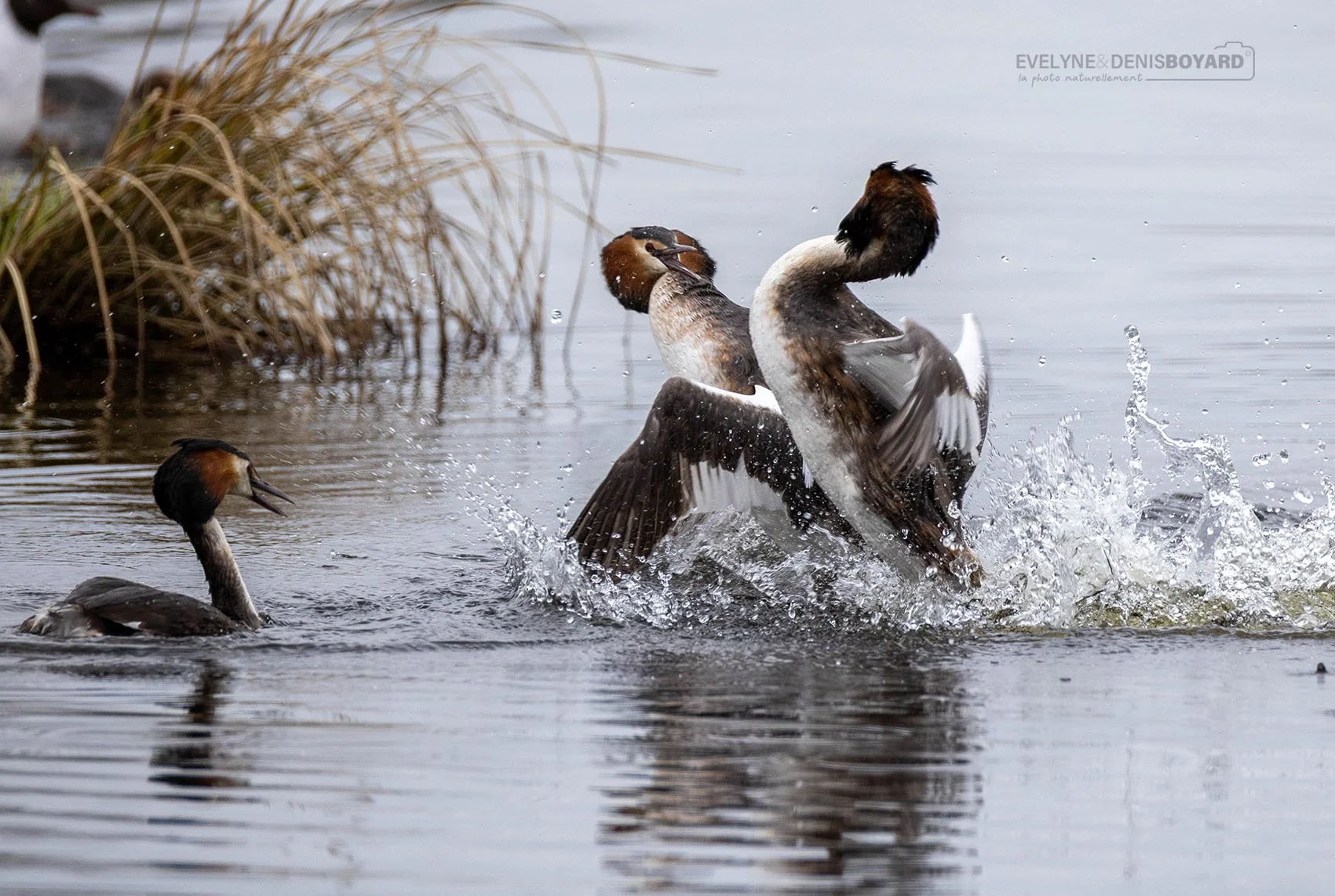 Combat de grèbes huppés pendant la période de reproduction.