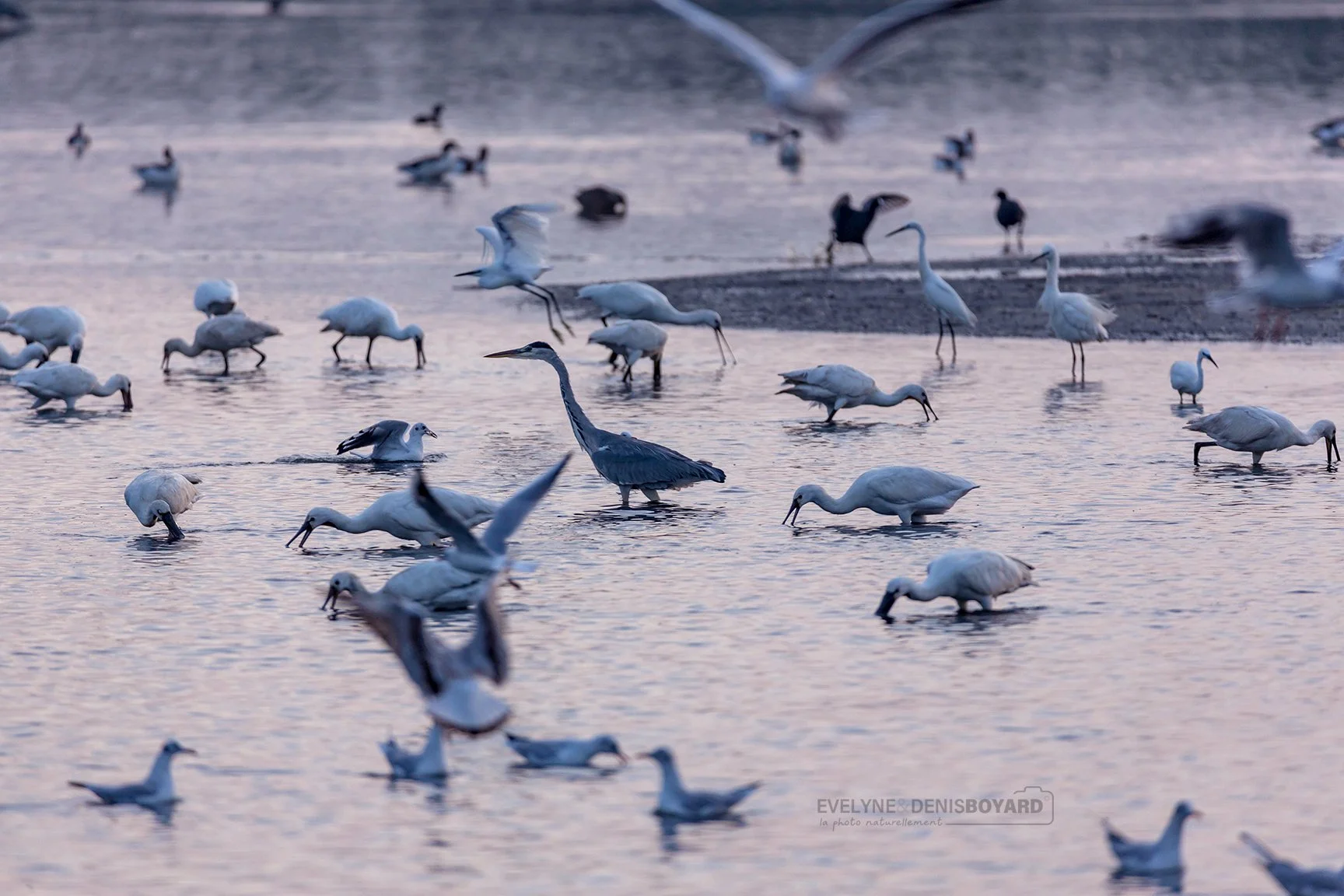 Pêche collective (hérons cendrés, spatules blanches, mouettes rieuses, aigrettes gazettes, grande aigrette, foulques macroules).