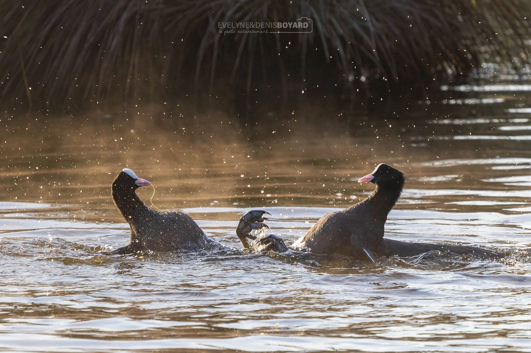Combat de foulques macroules pendant la période de reproduction.