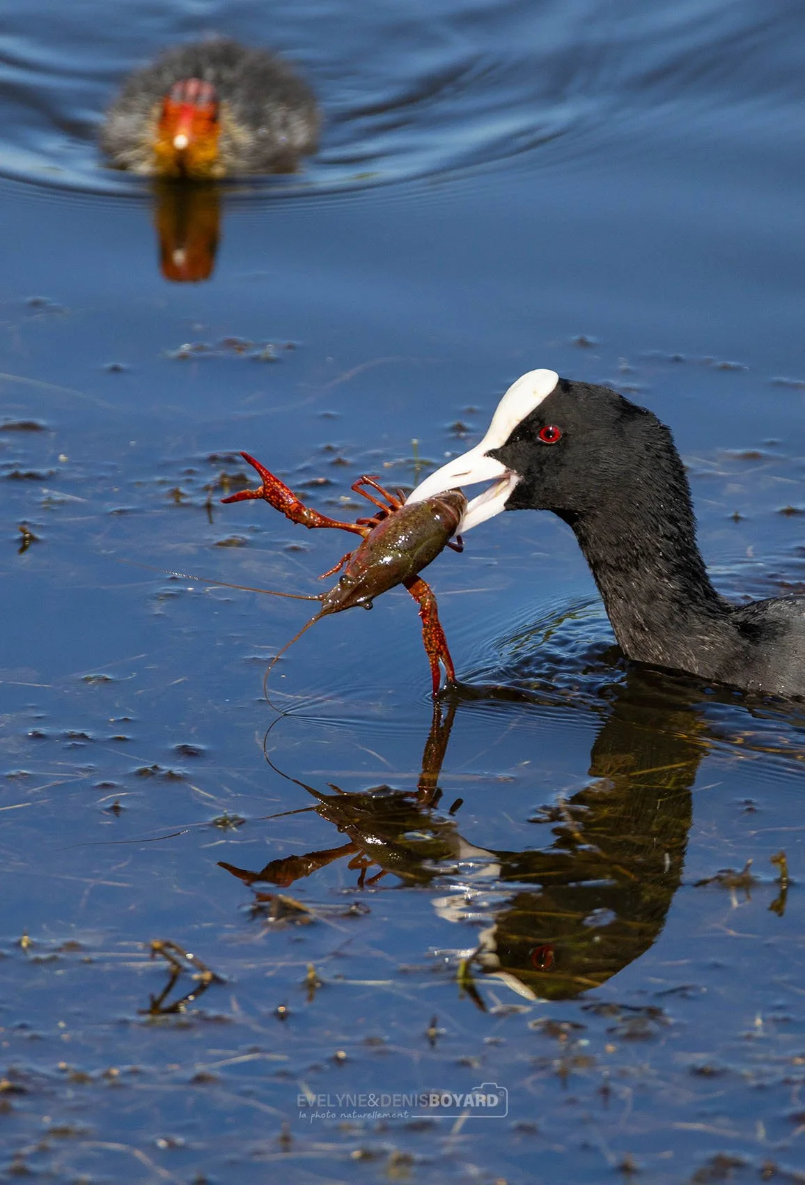 Foulque macroule se nourrissant d'une écrevisse américaine. En arrière-plan, un de ses jeunes.