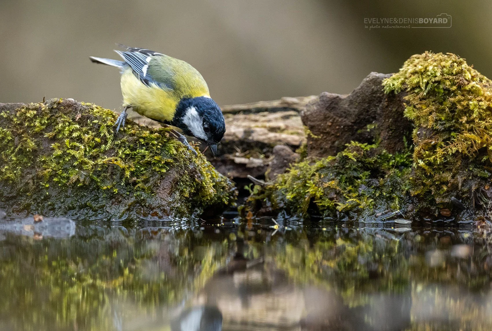 Mésange charbonnière s'abreuvant à à un point d'eau.