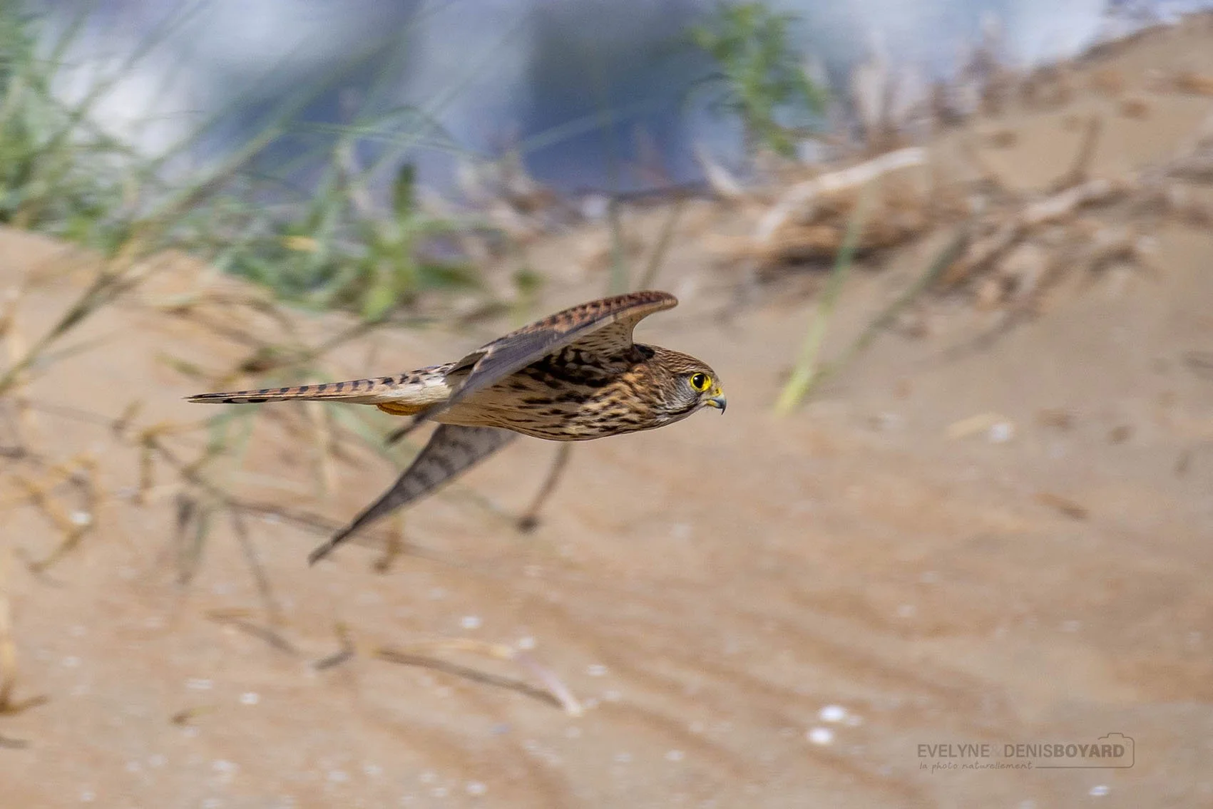 Envol d'un faucon crécerelle.